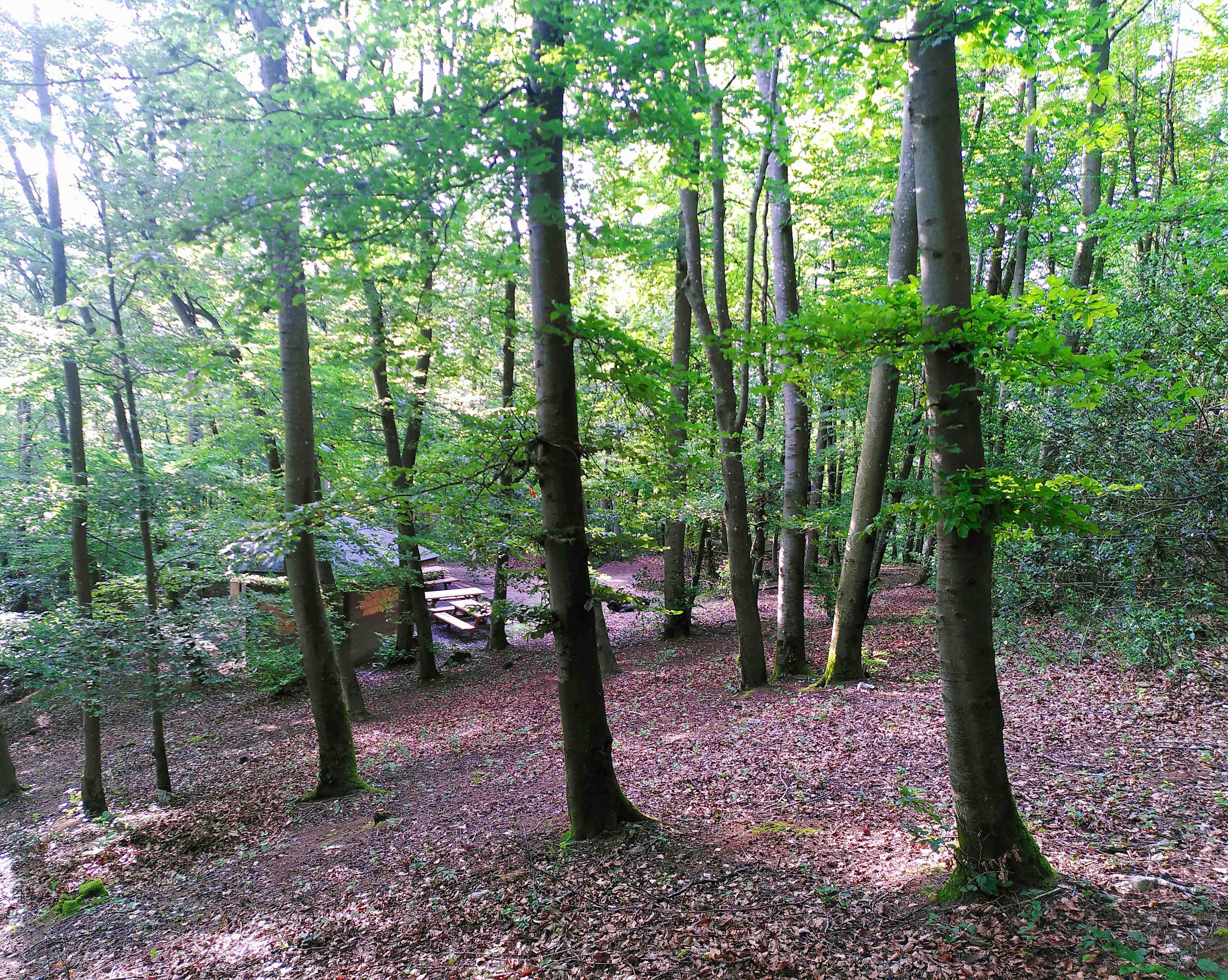 Der Wald herum ist offen und super zum Hütten bauen und spielen. Im Falle von Regen ist es praktisch,